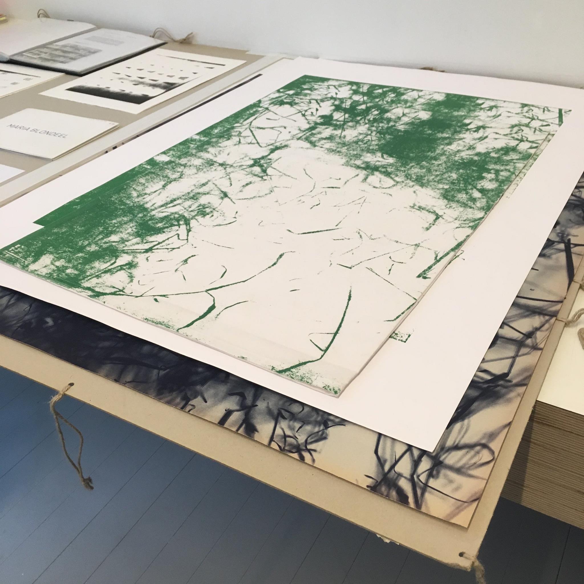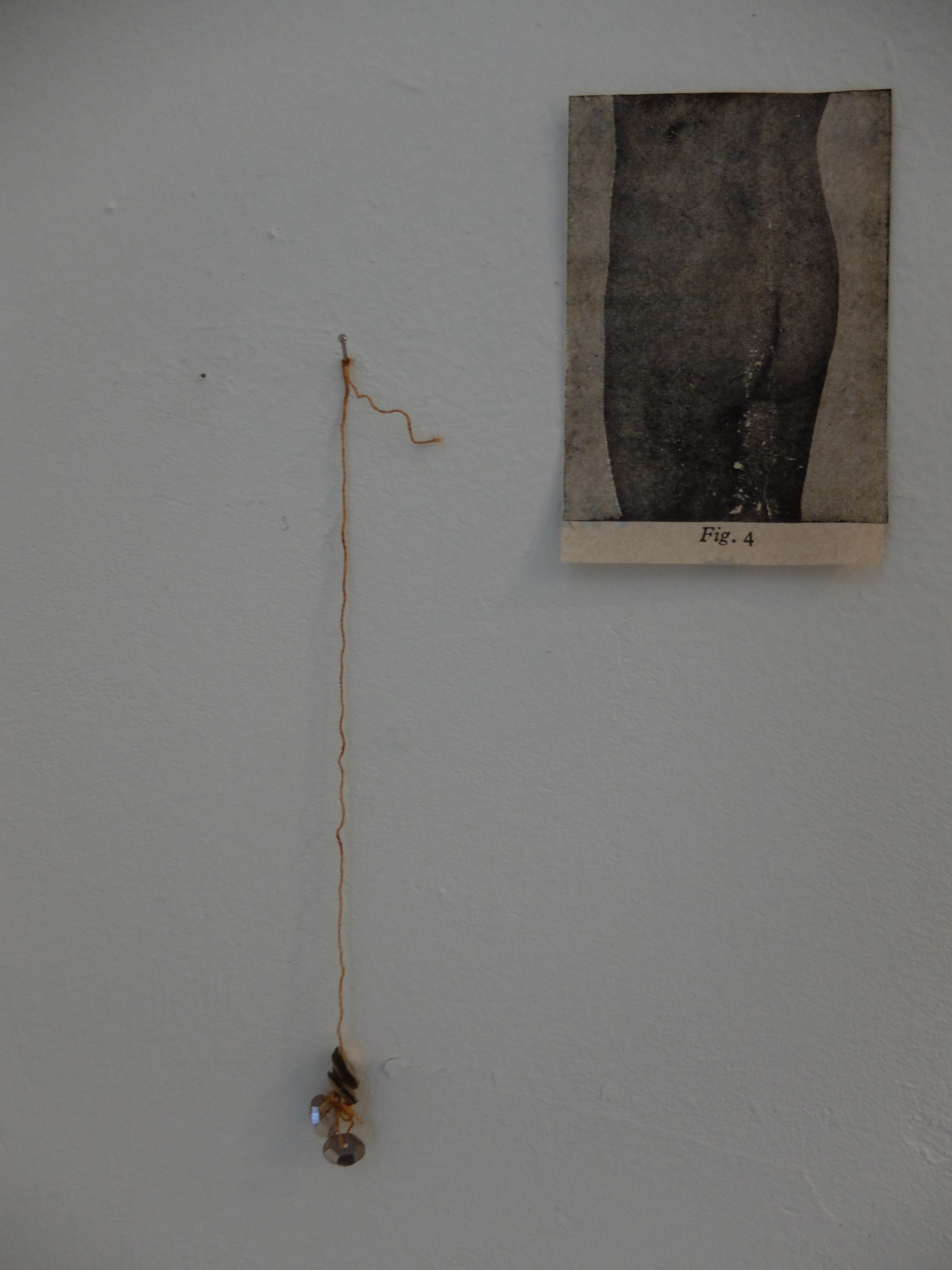 Aan de rechterkant op en boven de tafel zijn kleurrijke werken van beide kunstenaars samengebracht. Aan de muur hangt een collage met verschillende stukken doek van Hyun Dekempe waar je duidelijk nog de sporen van zijn maakproces in ziet. Potloodlijnen, zwarte vegen en drippings worden niet verborgen, en ook de lappen katoen of papier worden niet netjes weggestopt in een kader. Integendeel. Het statement om overschotten te gebruiken als werkmateriaal geldt eveneens voor Juliette Vanwaterloo: tweedehandsgaren krijgt in haar handen een nieuw leven. De getufte tapijtjes van vuurhaarden zijn vastgeplakt op houten staanders met verwijzingen naar een betonblok, dat vaak op straten of pleinen wordt gezet tegen terroristische aanvallen, een SUV, een type auto dat de looks van een terreinwagen combineert met het comfort en de functionaliteit van een personenauto (Sports Utility Vehicle) en een pul RoundUp, een merknaam voor een onkruidbestrijdingsmiddel dat verboden is voor particulier gebruik (glyfosaathoudende middelen). Op een dag als vandaag waarop de kerstboomverbranding is ingepland (strand van Mariakerke), brengt het vuur warmte om het oude jaar af te sluiten of de boel grondig op te ruimen of op te hitsen.