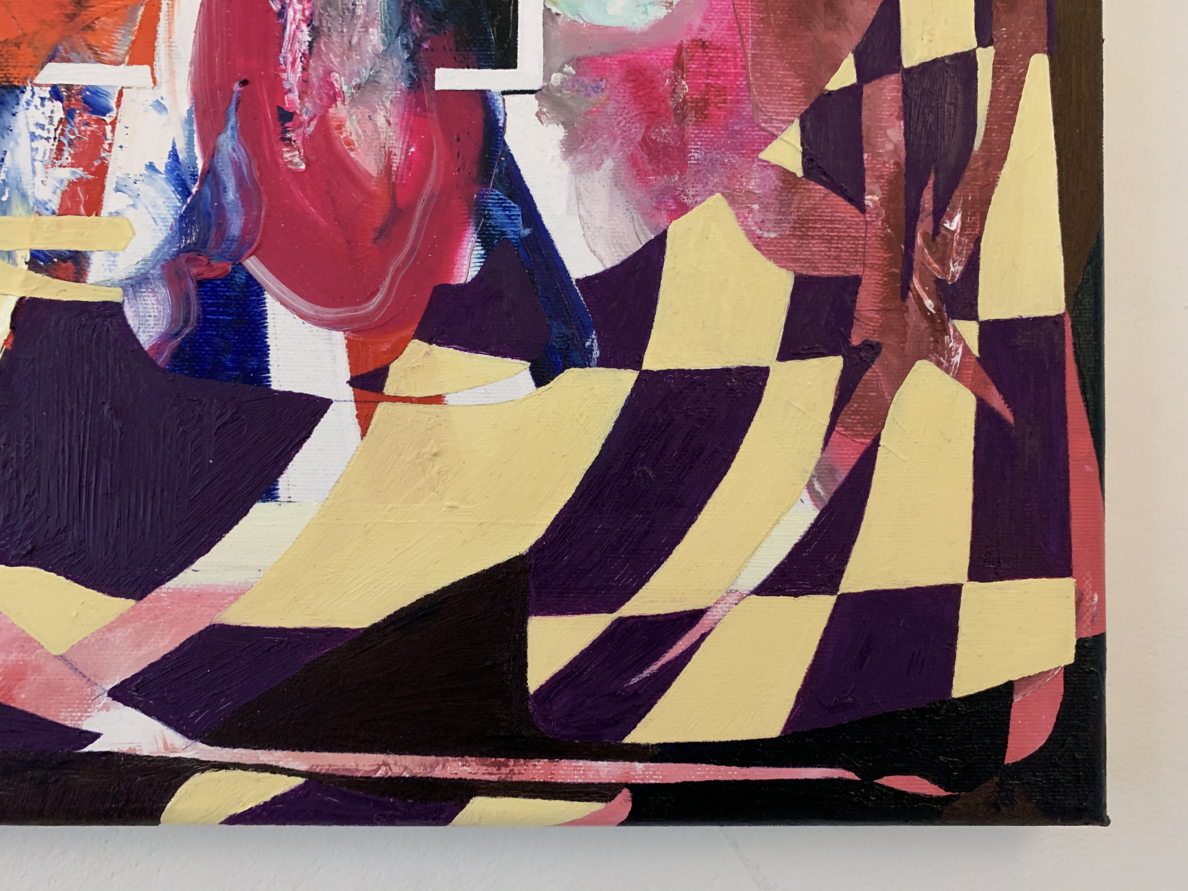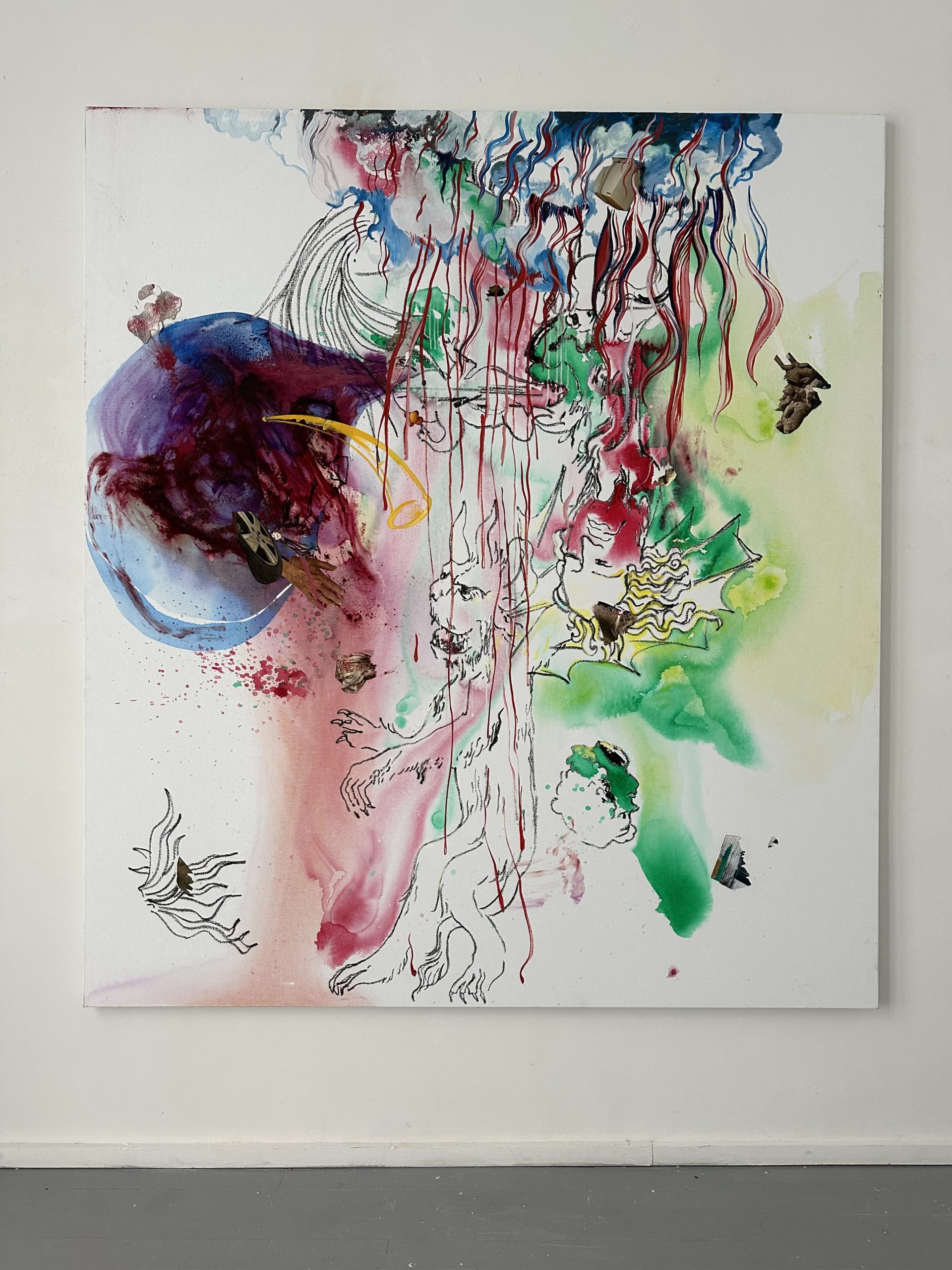In de gang verwelkomt een groot doek ons met een schilderij van een vlag met franjes rondom rond. De afbeelding lijkt op een historische vlag van het graafschap Vlaanderen, met een zwarte leeuw op een geel veld, die al in 12e eeuw werd gebruikt, hoewel de rode tong en de klauwen pas later werden gestandaardiseerd. Tegelijk symboliseert een gouden leeuw in de Aziatische cultuur rijkdom, geluk en voorspoed en wordt vaak geassocieerd met een keizerlijke status. In een van zijn klauwen houdt de gouden leeuw een Koreaanse bloem vast, een soort hibiscus die nooit zou verwelken. Verschillende culturele achtergronden komen dan ook vaker samen in het oeuvre van Hyun Dekempe, die het als een groot geluk ervaart om in België te kunnen opgroeien en een leven als kunstenaar te kunnen uitbouwen. Op het doek onderaan vind je eveneens een aantal elementen terug, die allicht voor verwarring zorgen: een pot kimchi, een traditioneel Koreaans bijgerecht van gefermenteerde groenten en een bakje Belgische frietjes met mayonaise, die soms als ‘french fries’ door het leven gaan, verwijzend naar een manier van bakken of snijden. Hyun Dekempe zoekt de onrust op, beklemtoont en relativeert tegelijkertijd, maar weet heel bewust hoe symbolen niet alleen over identiteit spreken, maar evenzeer over uitsluiting: in het midden ligt een borstel of een vloertrekker, verwijzend naar de verkiezingsretoriek van het Vlaams Blok van destijds. Het tafereel wordt links en rechts nog eens omzoomd met drie verticale strepen, de nationale vlag, die zwart-geel-rood is gekleurd. Of was het nu rood-geel-zwart. Het portret op het einde van de gang kan misschien helpen: de eerste koning der Belgen en graag geziene gast in het Oostende van weleer, Leopold I. Zijn gezicht komt terug op het kleinere werkje op karton, waar hij prijkt op een biljet van ‘100 dollar’ van The United States of Belgium.